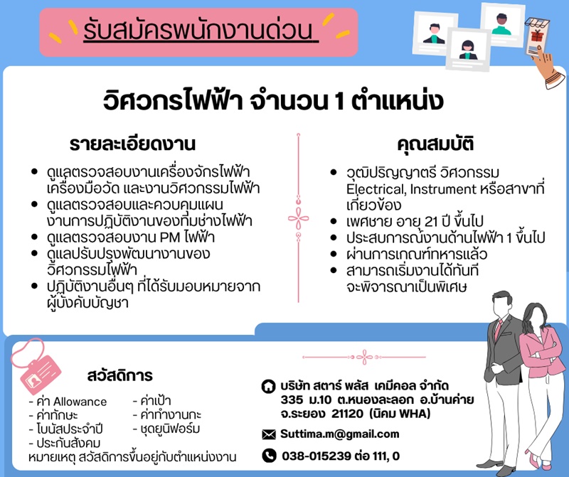 - มีประสบการณ์ทำงานด้านการผลิตอย่างน้อย 2 ปี อุตสาหกรรมเคมีจะได้รับการพิจารณาเป็นพิเศษ