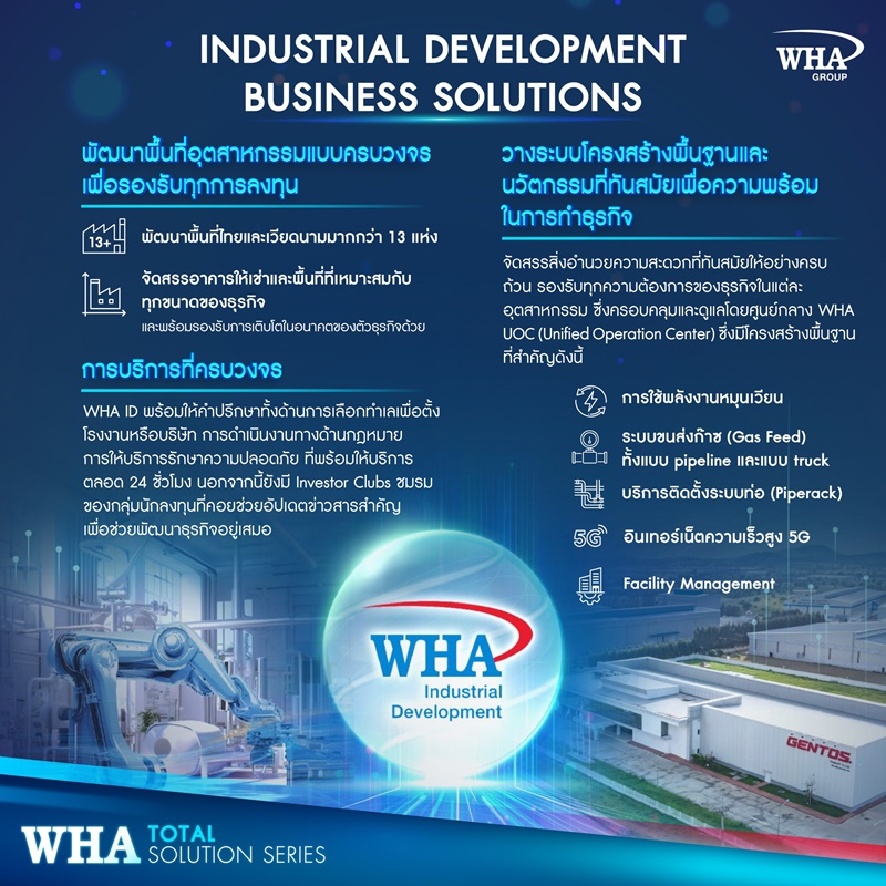 WHA ID มุ่งมั่นพัฒนาพื้นที่อุสาหกรรมในประเทศไทยและเวียดนามกว่า 13 แห่ง พร้อมโครงสร้างพื้นฐานที่ทันสมัยและบริการที่ครบวงจร เพื่อช่วยให้การลงทุนของคุณเป็นไปอย่างราบรื่นและมีประสิททธิภาพสูงสุด​