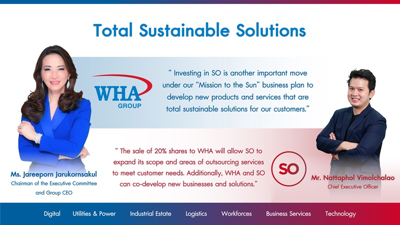 Ms. Jareeporn Jarukornsakul, Chairman of the Executive Committee and Group CEO of WHA Corporation PCL., said: “Investing in SO is another important move under our “Mission to the Sun” business plan through combining WHA's strengths in a comprehensive ecosystem and SO's strengths in lean operations with technology and innovation aiming to develop new products and services that are total sustainable solutions for our customers.”