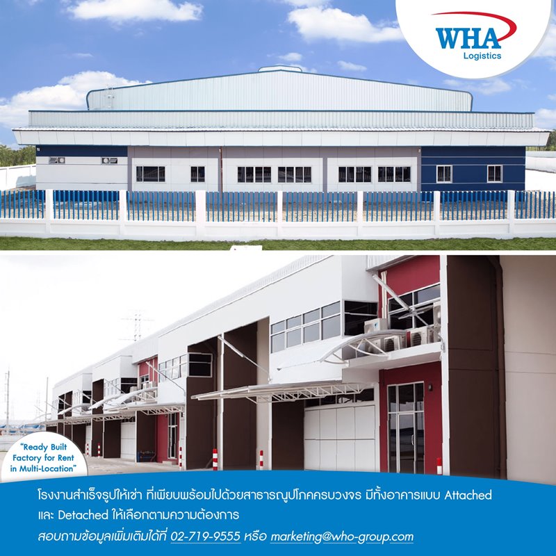 WHA Group offers Ready Built Factory for rent in multi-location ranging from 500 to 9,900 square meters which helps serving the diverse needs of investors. The investors can set up their manufacturing immediately. There are two types of buildings to choose from. “Attached’ factories are the connected factories sharing the same wall while, “Detached’ factory is a stand alone building with space for further expansions are available.​