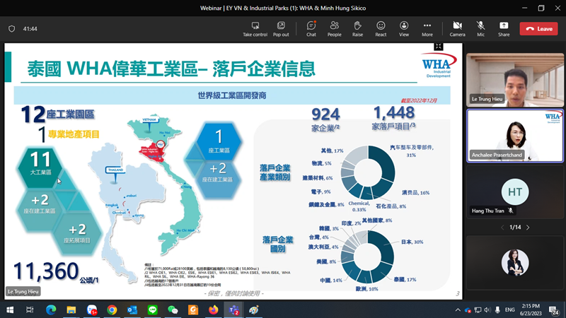 Ms. Anchalee Prasertchand, Vice President – International, WHA Industrial Development, and Mr. Le Trung Hieu, Senior Manager - Customer Development, WHA Industrial Management Services Vietnam Co., Ltd., were invited as guest speakers for the virtual seminar entitled “Vietnam Industrial Park Introduction” organized by EY Vietnam.