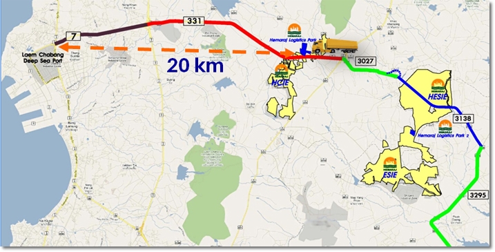 Strategically located on new highway 331 between Hemaraj Eastern Seaboard industrial estates and Laem Chabang Port, Hemaraj Logistics Park 1 comprises 280 rai and net sellable/rentable 220 rai with 129,000 square meters of warehouse for rent, offering high quality distribution warehousing for industry and third party logistic providers.