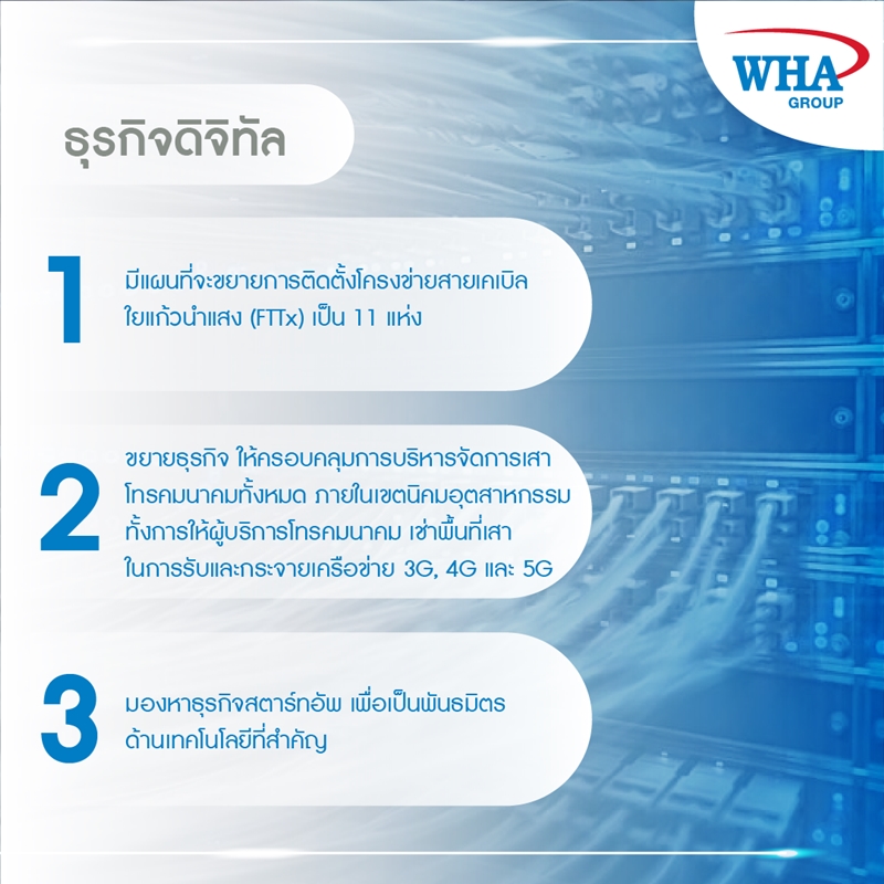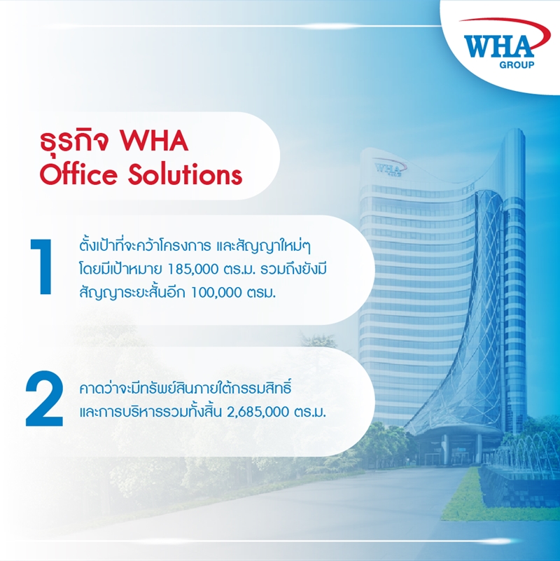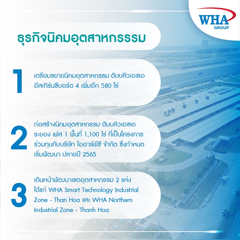 - เดินหน้าพัฒนาเขตอุตสาหกรรม 2 แห่ง ในประเทศเวียดนาม ได้แก่ WHA Smart Technology Industrial Zone - Than Hoa และ WHA Northern Industrial Zone - Thanh Hoa