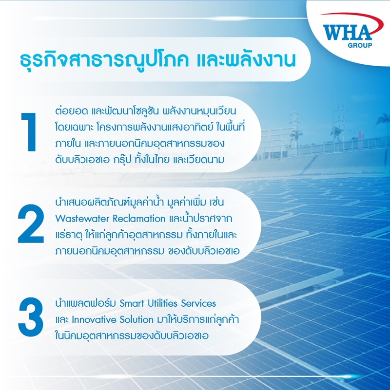 - ต่อยอด และพัฒนาโซลูชัน พลังงานหมุนเวียน โดยเฉพาะ โครงการพลังงานแสงอาทิตย์ ในพื้นที่ภายใน และภายนอกนิคมอุตสาหกรรม ของ ดับบลิวเอชเอ กรุ๊ป ทั้งในไทย และเวียดนาม