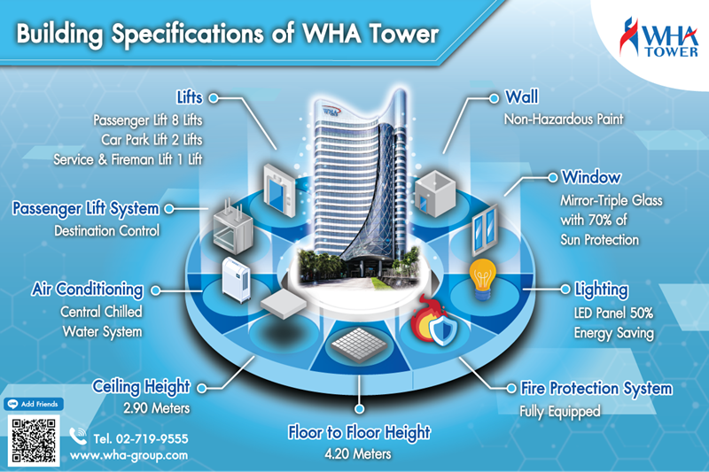 WHA Tower อาคารสำนักงานที่ออกแบบมาเพื่อธุรกิจที่กำลังมองหาออฟฟิศที่เต็มไปด้วยสิ่งอำนวยความสะดวกแบบครบครัน มาพร้อมกับโครงสร้างอาคารที่แข็งแรง ทันสมัย เพื่อให้ผู้เช่าได้รับความสะดวกสบายเต็มที่ ไม่ว่าจะเป็น