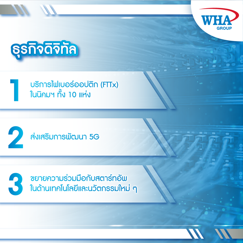 ดำเนินแผนการให้บริการไฟเบอร์ออปติก (FTTx) ในนิคมอุตสาหกรรมทั้ง 10 แห่งของดับบลิวเอชเอในประเทศไทย ซึ่งปัจจุบัน FTTx ได้ให้บริการแก่ลูกค้าทั้งหมดในนิคมอุตสาหกรรม 6 แห่ง ในขณะที่กำลังดำเนินการติดตั้งให้ครอบคลุมพื้นที่ในนิคมอุตสาหกรรมที่เหลืออยู่อีก 4 แห่ง