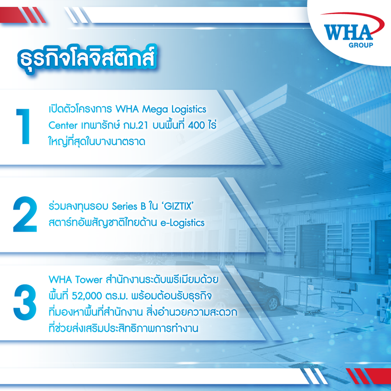 เดินหน้าในการนำเทคโนโลยีอัจฉริยะมาปรับใช้เพื่อสร้างโซลูชันบริการที่เปี่ยมนวัตกรรมแบบครบวงจรที่สร้างมูลค่าใหม่ ๆ มุ่งตอบโจทย์ความต้องการของลูกค้า ทั้งนี้บริษัทฯ ได้เข้าซื้อหุ้นร้อยละ 29.40 ในบริษัท สตอเรจ เอเชีย จำกัด ผู้ให้บริการให้เช่าพื้นที่จัดเก็บทรัพย์สินส่วนบุคคลระดับพรีเมียม ภายใต้แบรนด์ “i-Store Self Storage” โดยดับบลิวเอชเอจะใช้ความเชี่ยวชาญและองค์ความรู้ในธุรกิจโลจิสติกส์มาสนับสนุนสตอเรจ เอเชีย ในการสร้างสรรค์การให้บริการพื้นที่จัดเก็บทรัพย์สินส่วนบุคคลให้มีประสิทธิภาพมากขึ้นด้วยการใช้เทคโนโลยีและนวัตกรรมขั้นสูง ซึ่งในปีนี้ดับบลิวเอชเอ กรุ๊ป มีแผนที่จะขายทรัพย์สิน ได้แก่โครงการ Built-to-Suit Warehouse และ General Warehouses ขนาด 180,000 ตารางเมตร เข้ากองทรัสต์ WHART ด้วยมูลค่าทรัพย์สินรวมกว่า 5,500 ล้านบาท