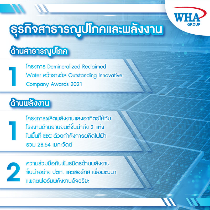 ด้านสาธารณูปโภค ดับบลิวเอชเอ ยูทิลิตี้ส์ แอนด์ พาวเวอร์ ยังคงเดินหน้าขยายผลิตภัณฑ์และโซลูชันอย่างต่อเนื่อง โดยเน้นไปที่ผลิตภัณฑ์น้ำมูลค่าเพิ่ม เช่น โครงการ Wastewater Reclamation และการผลิตน้ำที่ปราศจากแร่ธาตุ (Demineralized Water) โดยใช้เทคโนโลยีเมมเบรนรีเวิร์สออสโมซิส ในช่วงครึ่งแรกของปี 2564 WHAUP ได้เพิ่มปริมาณการผลิตน้ำประปาและการบำบัดน้ำเสีย รวมถึงผลิตภัณฑ์น้ำมูลค่าเพิ่ม เพิ่มขึ้นถึงร้อยละ 16 และ 170 ตามลำดับเมื่อเทียบกับช่วงเดียวกันของปีที่ผ่านมา โดยหลายโครงการอยู่ระหว่างการพัฒนาและดำเนินการก่อสร้าง เช่น โรงบำบัดน้ำแห่งใหม่ในนิคมอุตสาหกรรมดับบลิวเอชเอ ระยอง 36 ซึ่งมีกำลังการผลิตอยู่ที่ 2.74 ล้านลูกบาศก์เมตรต่อปี โรง reclamation และโรงผลิตน้ำปราศจากแร่ธาตุ ยังให้บริการน้ำปราศจากแร่ธาตุแก่ลูกค้านอกนิคมอุตสาหกรรมของดับบลิวเอชเอ และโครงการน้ำดิบทางเลือก ด้วยกำลังการผลิต 6 ล้านลูกบาศก์เมตรต่อปี