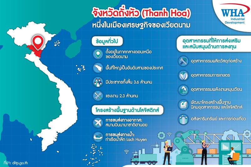 WHA ได้ลงนามความร่วมมือกับรัฐบาลท้องถิ่นประจำจังหวัดถั่งหัว (Thanh Hoa) เพื่อพัฒนาเขตอุตสาหกรรม 2 แห่งในจังหวัด โดยโครงการแรกจะใช้ชื่อว่า WHA Smart Technology Industrial Zone - Thanh Hoa ส่วนโครงการที่สองใช้ชื่อว่า WHA Northern Industrial Zone - Thanh Hoa โดยมีกลุ่มเป้าหมายคืออุตสาหกรรมปลายน้ำ ประกอบด้วย พลาสติก ยาง ผลิตภัณฑ์เคมีและเคมีชีวภาพ การแปรรูปโลหะและโรงหล่อ วัสดุก่อสร้าง ชิ้นส่วนยานยนต์ การประกอบเครื่องจักรกล เครื่องใช้ไฟฟ้าและอื่น ๆ ซึ่งบริษัทจะเริ่มดำเนินการเพื่อขอใบอนุญาตและการอนุมัติโครงการทันที และคาดว่าจะเริ่มก่อสร้างโครงการ WHA Smart Technology Industrial Zone – Thanh Hoa ในปี 2566 และ WHA Northern Industrial Zone – Thanh Hoa ในปี 2565