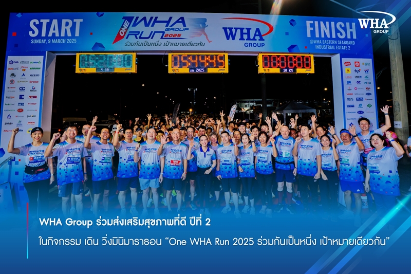 วันที่ 9 มีนาคม 2568 คุณจรีพร จารุกรสกุล ประธานคณะกรรมการบริหาร และประธานเจ้าหน้าที่บริหารกลุ่ม บริษัท ดับบลิวเอชเอ คอร์ปอเรชั่น จำกัด (มหาชน)(WHA) ให้เกียรติเป็นประธานในการเปิดกิจกรรมงานเดิน วิ่งมินิมาราธอน “ One WHA Run 2025-ร่วมกันเป็นหนึ่ง เป้าหมายเดียวกัน” ปีที่ 2 ในระยะทาง 3 กม. 5 กม.และ 10 กม. โดยมีคุณขวัญเรือน ศรีจันทร์ ปลัดจังหวัดชลบุรี และคุณธีรวุฒิ เจริญสุข รองผู้ว่าการ สายงานปฏิบัติการ 2 การนิคมอุตสาหกรรมแห่งประเทศไทย คณะผู้บริหาร บริษัท ดับบลิวเอชเอ คอร์ปอเรชั่น จำกัด(มหาชน) ตัวแทนกลุ่มผู้ประกอบการในนิคมอุตสาหกรรมดับบลิวเอชเอและชุมชนเข้าร่วม ในครั้งนี้มีนักวิ่งและประชาชนทั่วไปเข้าร่วมกว่า 1,200 คน ณ นิคมอุตสาหกรรมดับบลิวเอชเอ อีสเทิร์นซีบอร์ด 2 จังหวัดชลบุรี