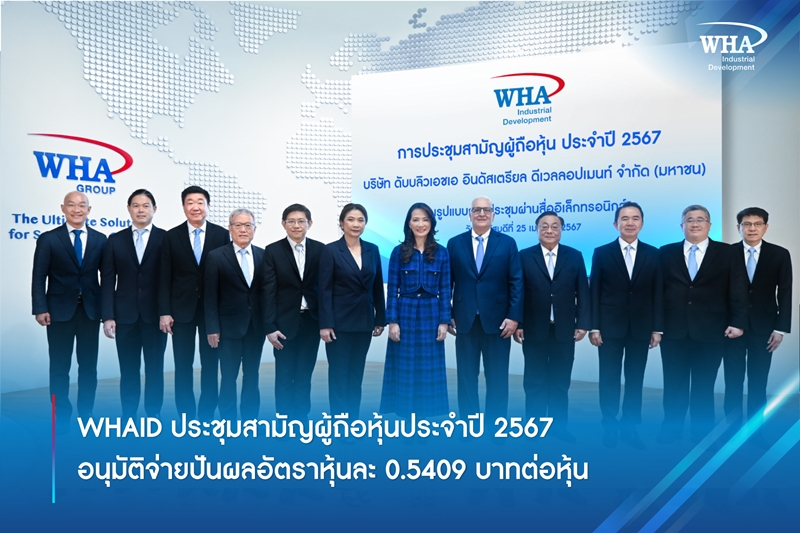 วันที่ 25 เมษายน 2567 กรุงเทพฯ นางสาวจรีพร จารุกรสกุล ประธานคณะกรรมการบริษัท (กลาง) พร้อมด้วยคณะกรรมการบริษัทและผู้บริหาร บริษัท ดับบลิวเอชเอ อินดัสเตรียล ดีเวลลอปเมนท์ จำกัด (มหาชน) (WHAID) ได้จัดการประชุมสามัญผู้ถือหุ้นประจำปี 2567 ผ่านสื่ออิเล็กทรอนิกส์ (E-AGM) โดยที่ประชุมผู้ถือหุ้นมีมติอนุมัติจ่ายปันผลเพิ่มเติม 0.5409 บาทต่อหุ้น หรือคิดเป็นจำนวนเงิน 5,250 ล้านบาท รวมเป็นการจ่ายเงินปันผลประจำปี 2566 ทั้งสิ้นในอัตราหุ้นละ 1.0045 บาท คิดเป็นจำนวนเงินทั้งสิ้นประมาณ 9,750 ล้านบาท พร้อมกำหนดวันปิดสมุดทะเบียนพักการโอนหุ้นเพื่อให้สิทธิผู้ถือหุ้นรับเงินปันผลในวันที่ 3 พฤษภาคม 2567 พร้อมกำหนดจ่ายเงินปันผลดังกล่าวในวันที่ 16 พฤษภาคม 2567