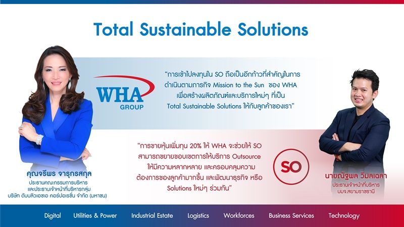 คุณจรีพร จารุกรสกุล ประธานคณะกรรมการบริหาร และประธานเจ้าหน้าที่บริหารกลุ่ม บริษัท ดับบลิวเอชเอ คอร์ปอเรชั่น จำกัด (มหาชน) กล่าวว่า “การเข้าไปลงทุนใน SO ถือเป็นอีกก้าวที่สำคัญในการดำเนินตามภารกิจ Mission to the Sun โดยเป็นการเอาจุดแข็งของ WHA ที่มี Ecosystem ที่ครบวงจร และจุดแข็งของ SO เรื่อง Lean Operation มาผสมผสานกับเทคโนโลยีและนวัตกรรม เพื่อสร้างผลิตภัณฑ์และบริการใหม่ๆ ที่เป็น Total Sustainable Solutions ให้กับลูกค้าของเรา