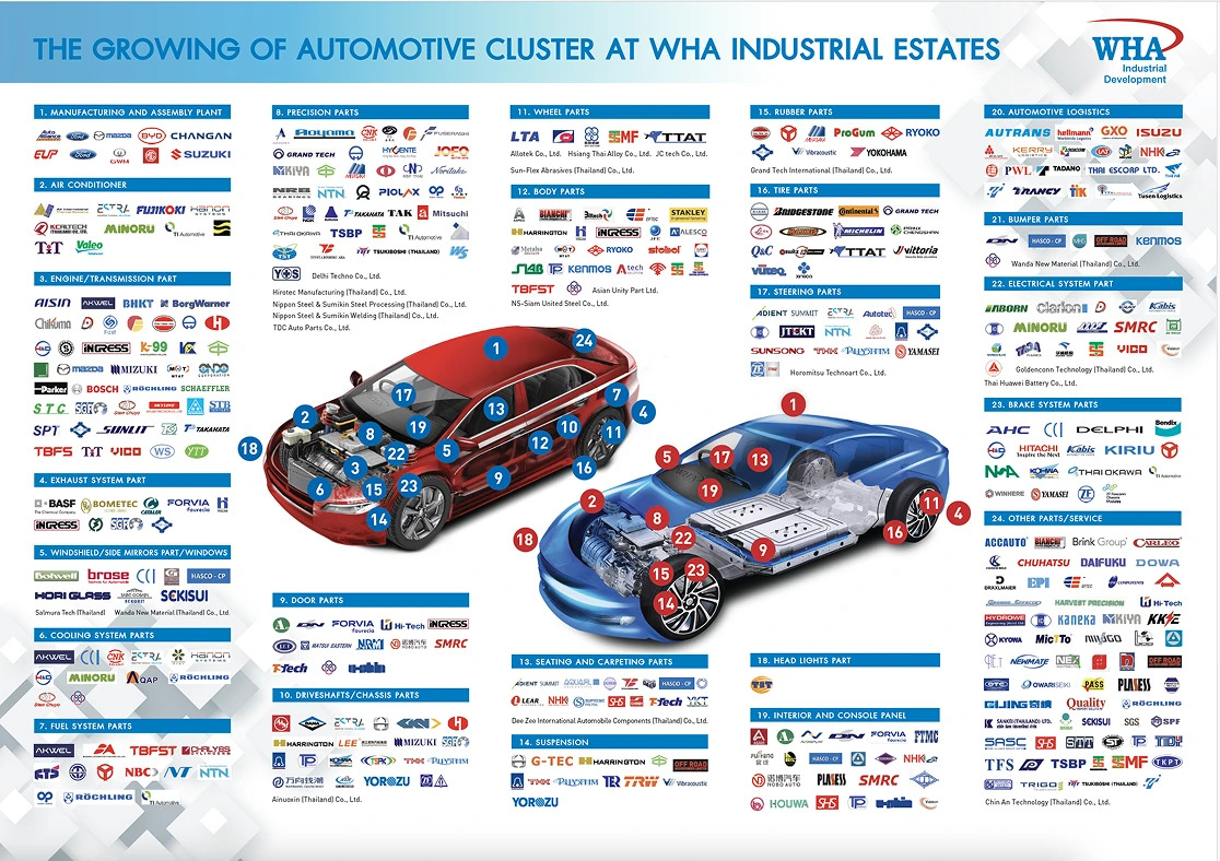 自上世纪90年代,WHA伟华集团就已经在WHA伟华东海岸工业区一区、二区和东海岸工业区(罗勇)打造了以汽车整车及上下游零部件企业为主的“汽车产业集群”。目前,该产业集群已成为泰国最具影响力的汽车产业集群,落户园区内的企业包括福特、马自达、长城汽车、铃木、上汽名爵等众多国际知名整车厂,及来自全球不同国家的280间汽车零部件企业。WHA伟华东方工业区(曼达普)已成为石化产业的重要聚集区。