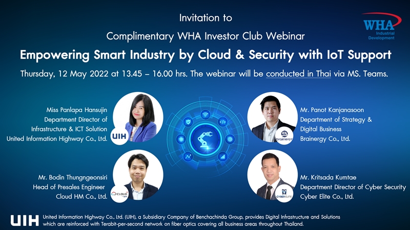 In this regards, WHA Industrial Development PLC would like to invite you to join WHA Investor Club Webinar: Empowering Smart Industry by Cloud & Security with IoT Support on Thursday, 12 May 2022 at 13.45 - 16.00 hrs. via MS. Teams. This webinar will be conducted in Thai and suitable for management, business development, procurement, HR and IT (IT Manager, IT Operation, IT Security, IT Admin or others who are interested in IT solutions).