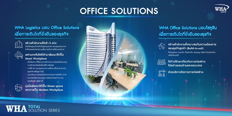 เพื่อการเติบโตอย่างยั่งยืนของธุรกิจ WHA Logistics ได้พัฒนาองค์ประกอบที่สำคัญสำหรับการทำธุรกิจผ่าน WHA Office Solutions ที่ให้บริการผ่านสำนักงานให้เช่าหลากหลายรูปแบบ ใน 5 ทำเลในพื้นที่สำคัญของกรุงเทพฯ และสมุทรปราการ เช่น WHA Tower, SJ Infinite I และ WHA Bangna Business Complex เป็นต้น ซึ่งล้วนแต่ตั้งอยู่บนพื้นที่ใกล้กับระบบขนส่งสาธารณะและเส้นทางหลัก เพิ่มความสะดวกสบายในการเดินทางยิ่งขึ้น​