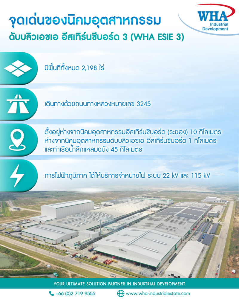 WHA Eastern Seaboard Industrial Estate 3 (WHA ESIE 3) is located at Nong Yai District, Chonburi Province. It is an industrial estate with specialized industries, such as the automotive parts industry, plastics and polymers, energy, metal forming, electronics, building materials, commodities, logistics, aerospace, as well as the robotics and automotive industries of the future.