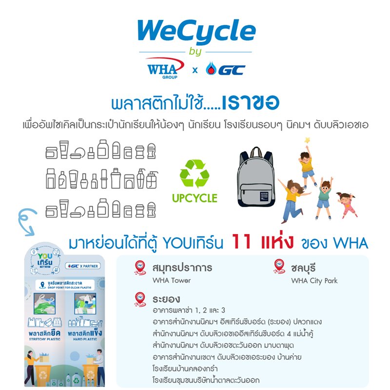 WHA Group ภายใต้โครงการ WeCYCLE ได้ร่วมมือกับ Youเทิร์น โดย GC รณรงค์เชิญชวนพนักงาน WHA Group และ ผู้ประกอบการในนิคมอุตสาหกรรมของ WHA Group มาเก็บพลาสติกที่ไม่ใช้แล้วมา รีไซเคิล (Recycle) กลับมาใช้ใหม่เพื่อลดปริมาณขยะพลาสติกในปัจจุบัน เพื่อที่ทางโครงการจะนำไปเข้าสู่การ อัพไซเคิล (Upcycle) กลับมาเป็นกระเป๋านักเรียนมอบให้น้องๆ นักเรียนในพื้นที่รอบๆ นิคมอุตสาหกรรมของ WHA Group โดยทาง WHA Group ได้จัดให้มีจุดรับพลาสติก (YOU เทิร์น) ณ อาคารสำนักงาน หรือบริเวณรอบๆ นิคมอุตสาหกรรม เพื่ออำนวยความสะดวกให้กับผู้ประกอบการในทุกๆ นิคมอุตสาหกรรมของ WHA Group ทั้งหมด 11 แห่ง
