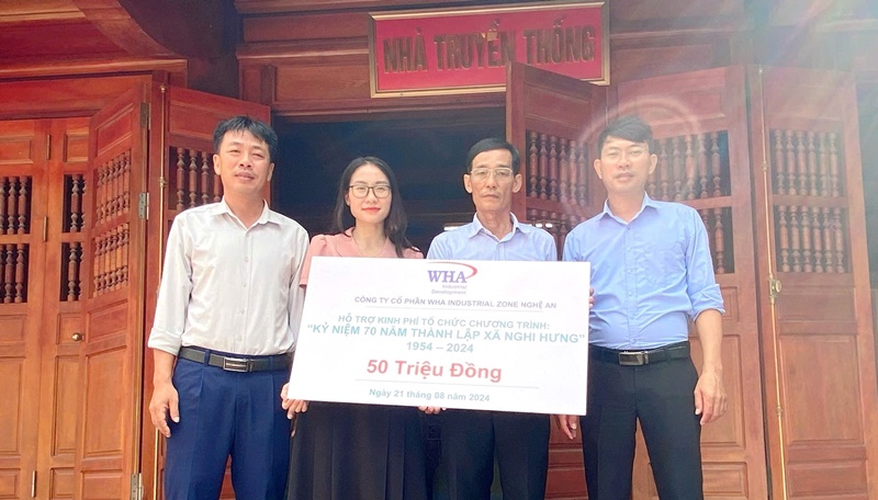 WHA Industrial Zone Nghe An continues to demonstrate its commitment to the local community by supporting the 70th anniversary celebrations of three communes: Nghi Long, Nghi Hung, and Nghi Thuan. As part of its ongoing Corporate Social Responsibility (CSR) initiatives, WHA has contributed VND 50 million to each commune to help organize the celebration activities, marking a significant milestone in their history.